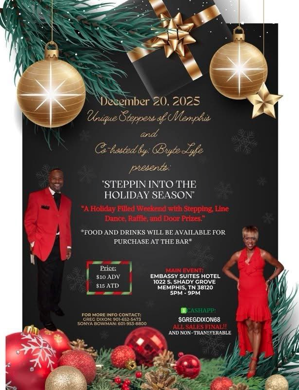 Steppers reminder:๐Ÿคถ๐Ÿพ๐ŸŽ„๐Ÿง‘๐Ÿพโ€๐ŸŽ„Step Into The Holiday Season with The Unique Steppers of Memphis at their annual Christmas Dance Party.
